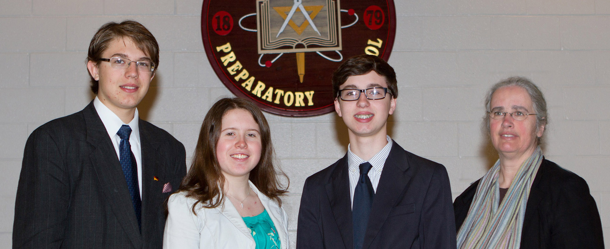 Three MMI Preparatory School students earned individual awards at the German Day 2015 competition. Pictured are, from left: Garrett Kost, first place in poetry; Sarah Moyer, third place in spelling; Sam Sessock, second play in poetry; and MMI World Language instructor Gabriela Moustardas.
