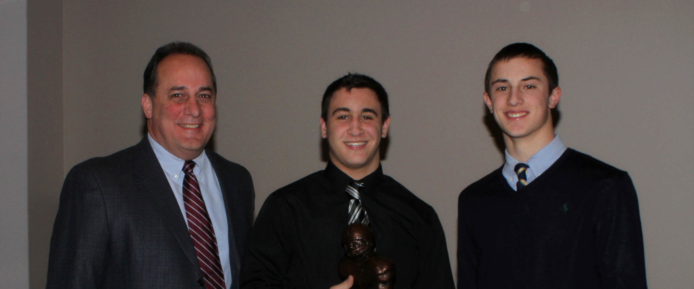 Mr. Richard Tomasetti and Brian Tomasetti present the Coach Vincent Tomasetti Memorial Award Outstanding Lineman to Anthony DeSando