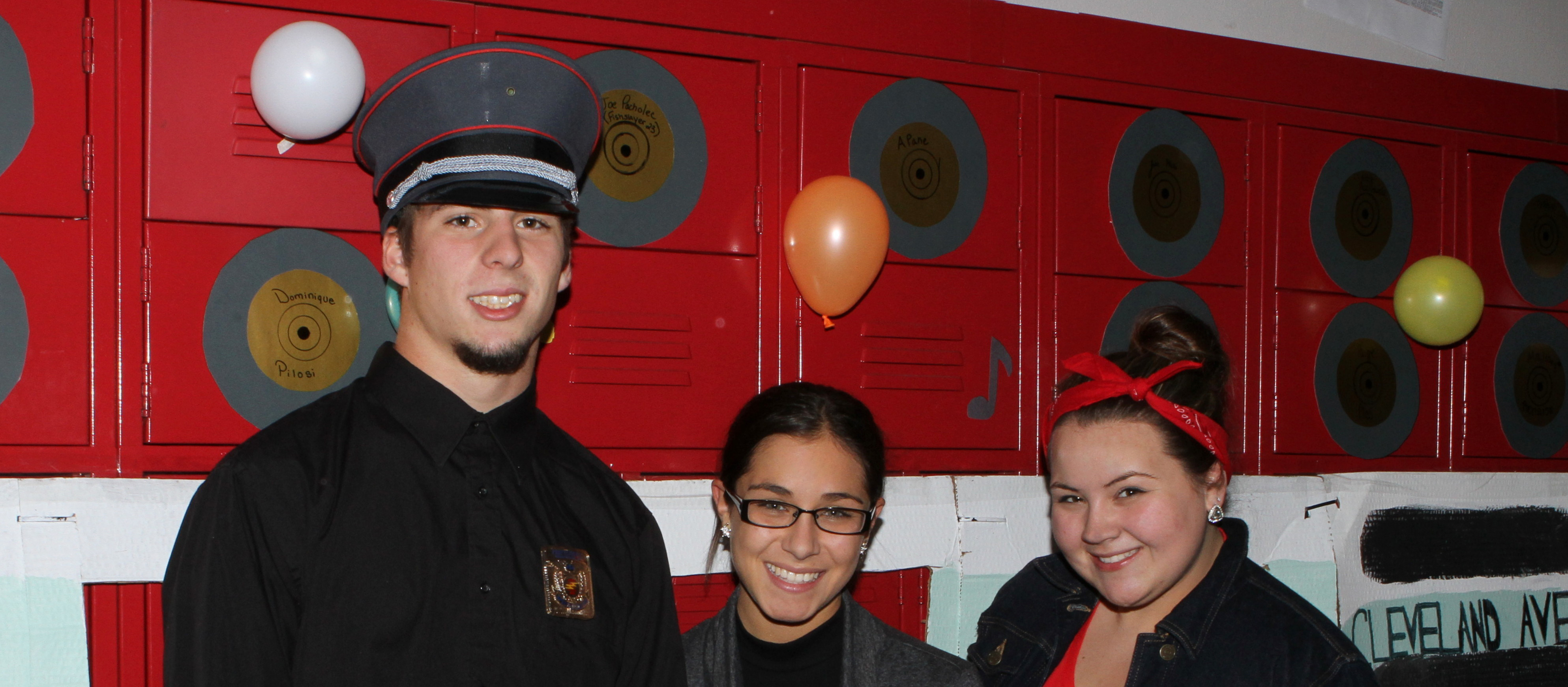Each class in the high school chose a decade and decorated their hallway in the high school according to the decade. Pictured are members of the senior class who chose the 1950s as their theme.