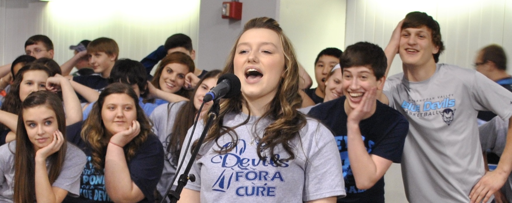 Recently the Shenandoah Valley Drama Club showcased their 2014 production of “The Producers”, the musical comedy by Mel Brooks, at the Wilkes Barre Penquins hockey game. The cast performed several numbers from the show during the second intermission of the game, and was given an enthusiastic ovation from the crowd.  Shown in photo is Meghan Artley (center) singing her solo backed by (L-R)  Karlee Keppel, Camryn Carduff, Evan Rooney, & Angelo Maskornick. Show times for “The Producers” are Friday & Saturday April 25th-26th at 7:00 PM & Sunday April 27th at 3:00 PM. Tickets are $8; also a  special 3 day pass for students/senior citizens for $20. Presale will begin on April 7th.  For further information call 570-462-1957.
