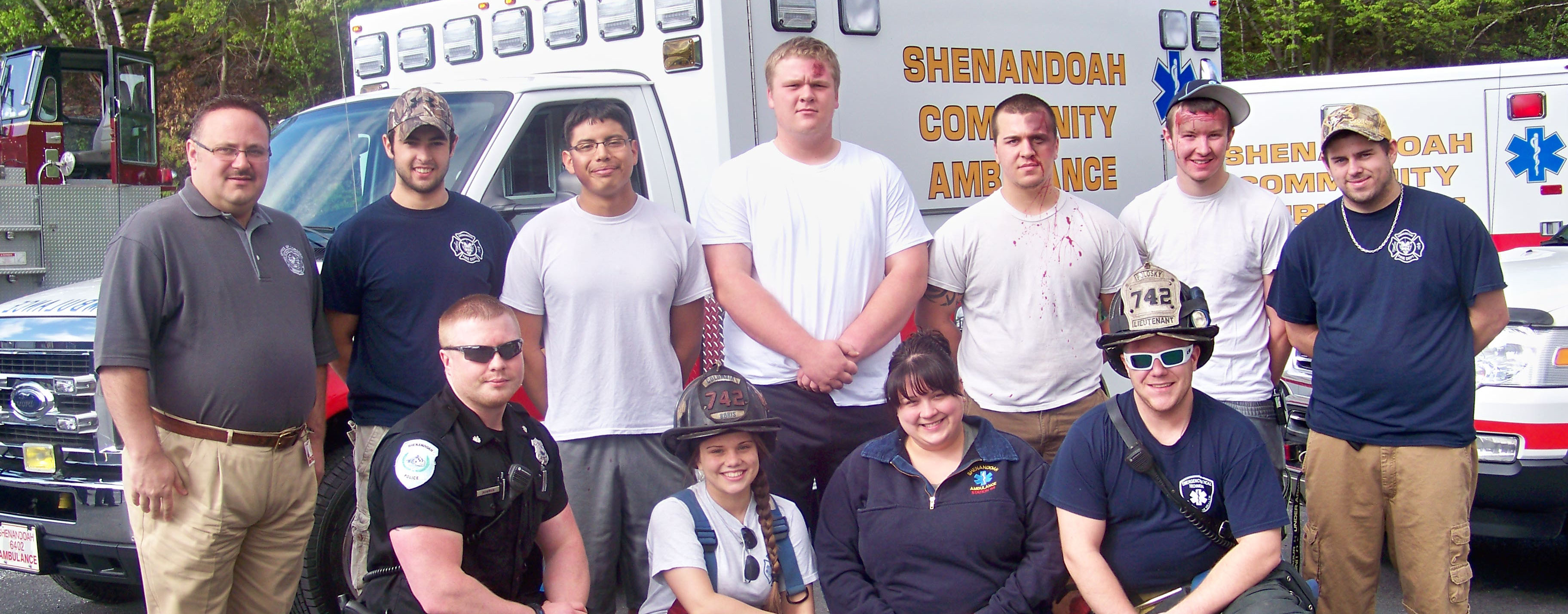 Shown in the photo are some of the volunteers who participated in the Mock DUI Accident staged by Shenandoah emergency responders and senior students from Shenandoah Valley High School who are certified junior firefighters. Kneeling (L-R): Travis Bowman Shenandoah Police Dept. Alyssa Boris Columbia Hose, Ann Marie Kovalewski Shenandoah Ambulance, & Greg Polosky Columbia Hose. Standing: Shenandoah Mayor & Schuylkill County Coroner Andrew Szczyglak, Steve Quinn Rescue Hook & Ladder, Jose Diaz Phoenix Fire Co. Chris Bonk & Polish American, Dave Gottshall, Frank Gallo, and Steve Boehmer Rescue Hook & Ladder.
