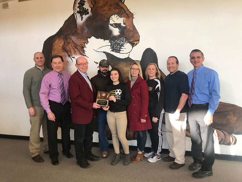 Pictured left to right: Chris Killiany, Valley View Athletic Director; Joe Semion, brother of the late Pauline Histed; Jerry Histed,husband of the late Pauline Histed and Award sponsor; Charles Collura, father; Rossalynn, award recipient; Jennifer Collura, Mother; Amy Hughes, Valley View High School Girls’ Head Soccer Coach; John Burman, Valley View High School Girls’ Assistant Coach; and Larry Pegula, Valley View High School Assistant Principal