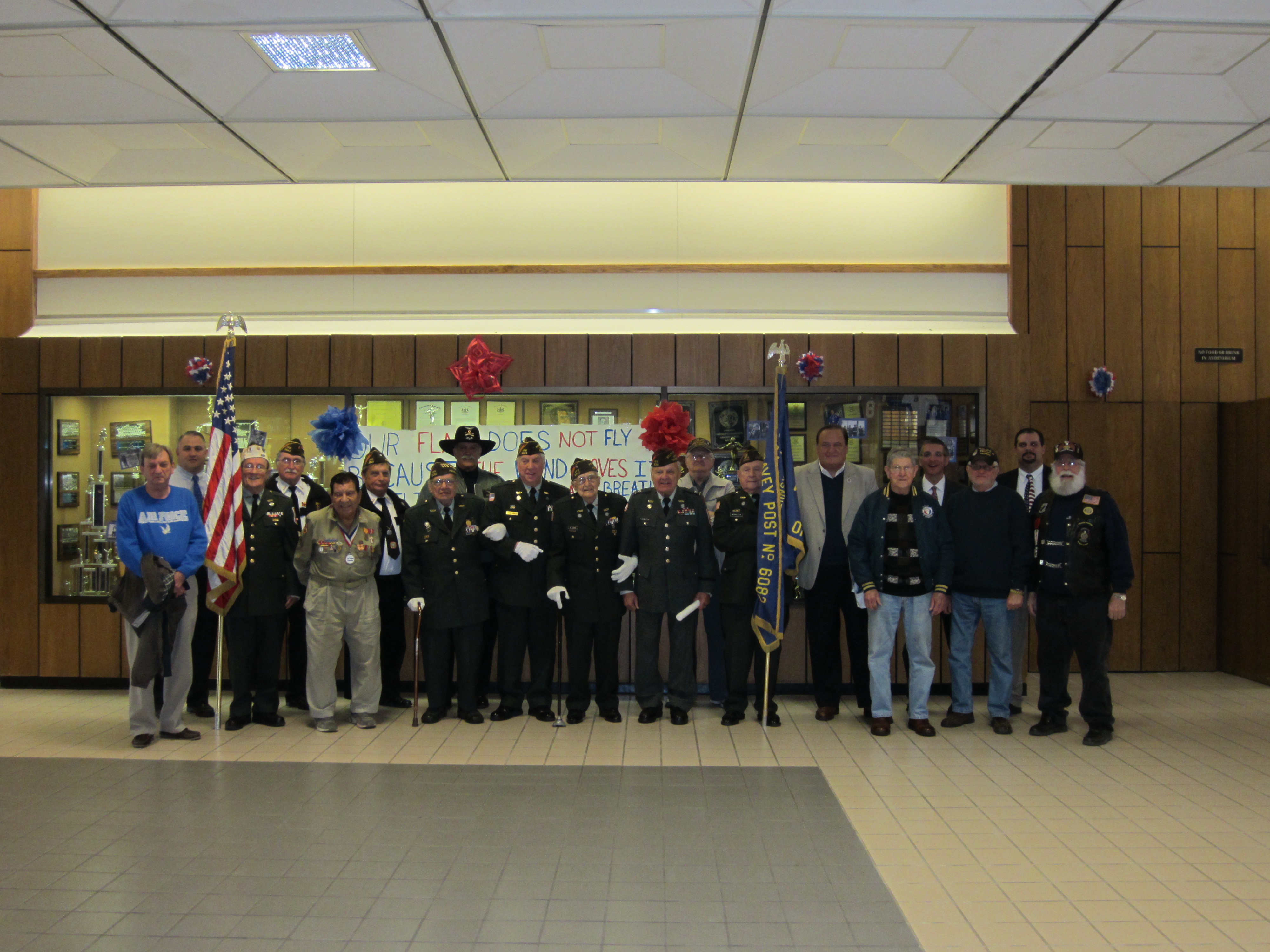 On Monday, November 9, 2015 Valley View High School celebrated Veteran’s Day. Valley View invited local veterans to come and join in the events of the day. This year’s theme,” VVHS Home of the Free because of the BRAVE.” was designed by the Valley View High School History Club under the direction of Mrs. Nicole Zeiss. The Club sold the shirts to faculty, staff and students and all proceed were given to the three local VFW Posts. Events of the day included a special choral and band presentation of patriotic songs performed by the Valley View High School Chorus directed by Ms. Gina Lupini and Band directed by Mr. Michael Lesnefsky. This year’s guest speaker was Mr. Peter Genova, Retired United States Air Force, served in the New Jersey State House, and 911 World Trade Center North Tower Survivor.